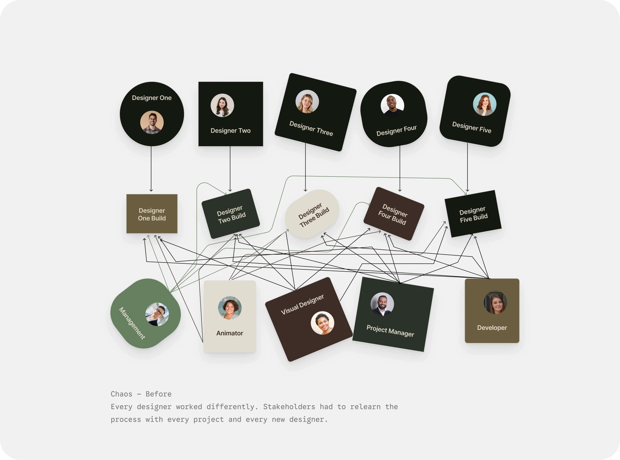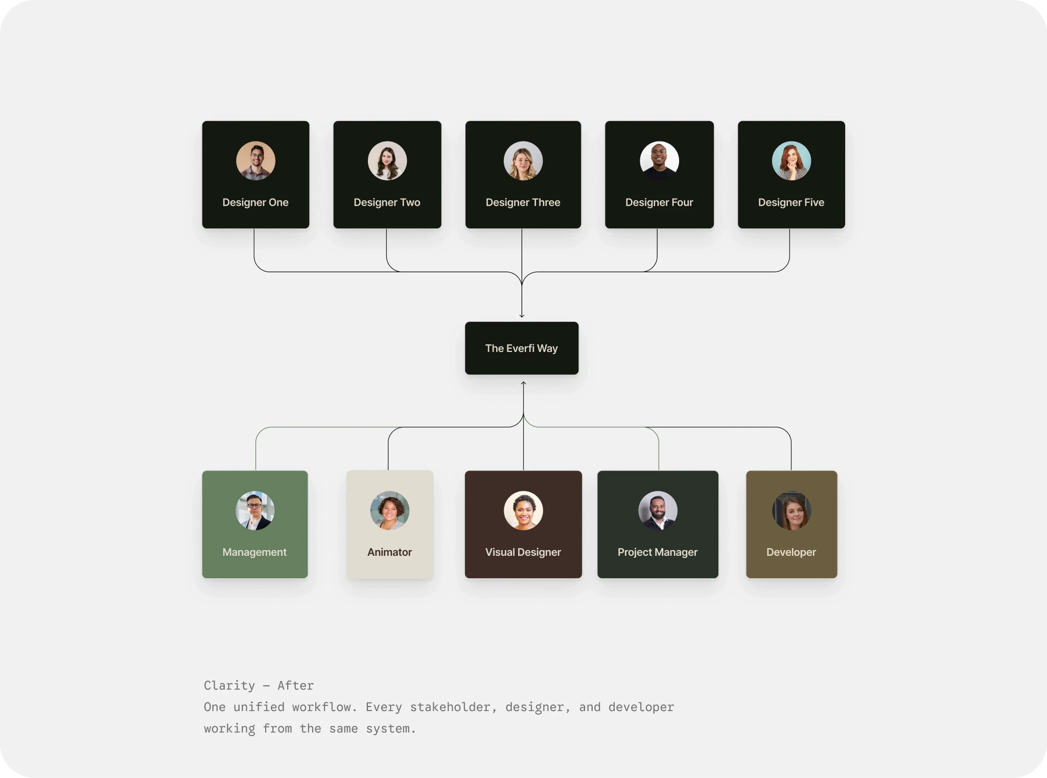 Everfi was producing world-class educational content but the design org was running on chaos. Contractors brought their own build styles, every file was structured differently, and stakeholders had to relearn where projects started, where they ended, and what was complete every single time with every single designer.