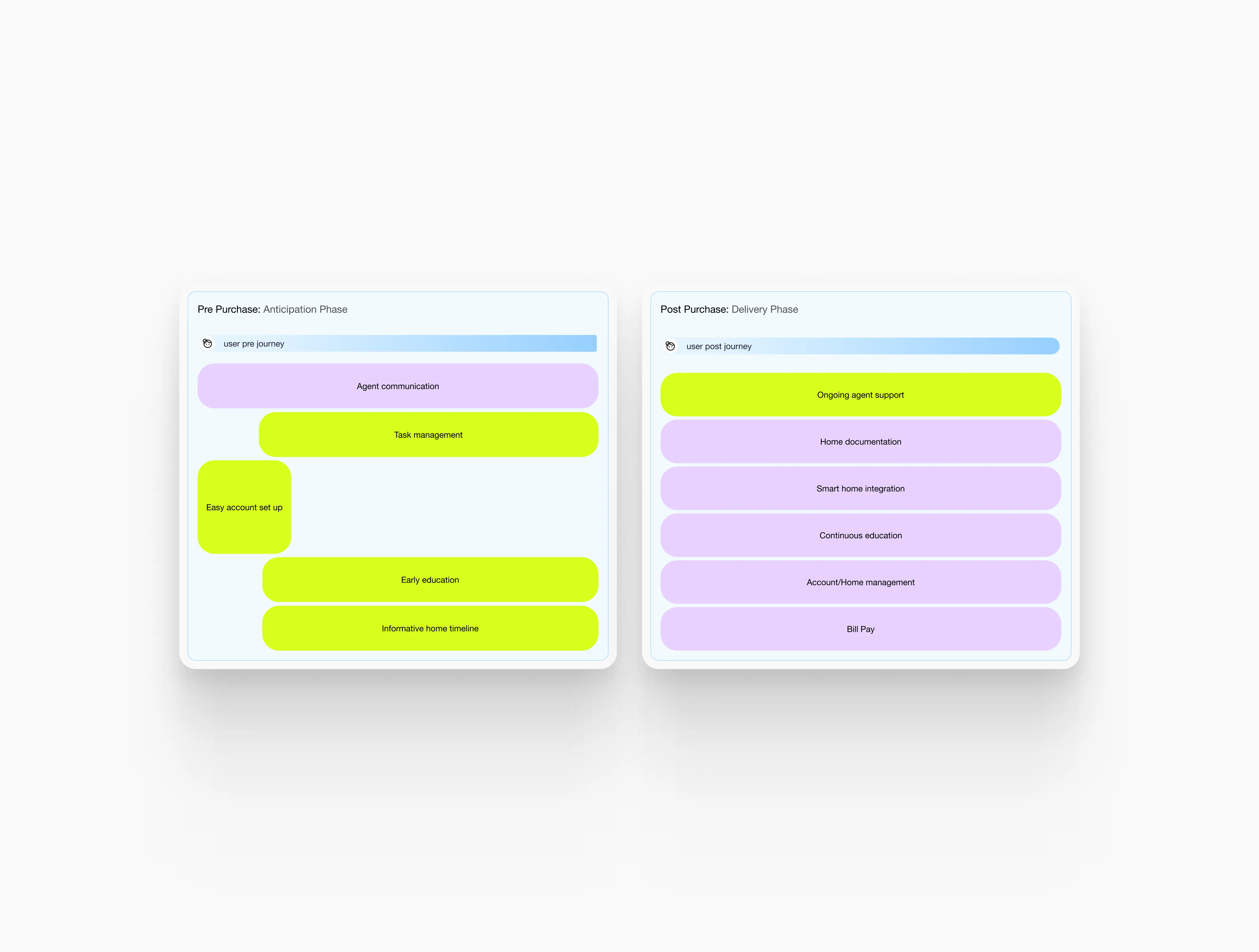 The team had already begun identifying various user struggles, but the data remained fragmented and anecdotal. Because the project was on a short timeline with no room for heavy documentation, I utilized a bottom-up approach to let a cohesive strategy emerge from this raw data. I began by laying out a sequence of user statements to build the backbone of the homebuyer journey. This helped the team visualize the big picture and identify gaps in the existing analog experience.