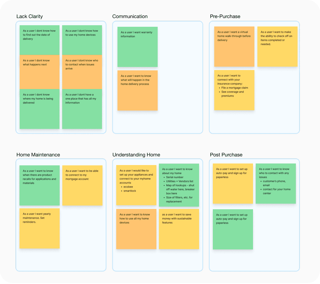 I then took these various user statements—representing specific desires, pain points, and conflicts—and synthesized them into a comprehensive Affinity Map. This allowed me to organize large amounts of unstructured stakeholder data and build consensus among a distracted team. Through this mapping process, we identified a critical Visibility Gap. Customers felt stuck in a "black box" after their initial deposit with no insight into the construction of their home. This lack of transparency led to status fatigue and a high volume of inquiries that created massive bottlenecks for agents.